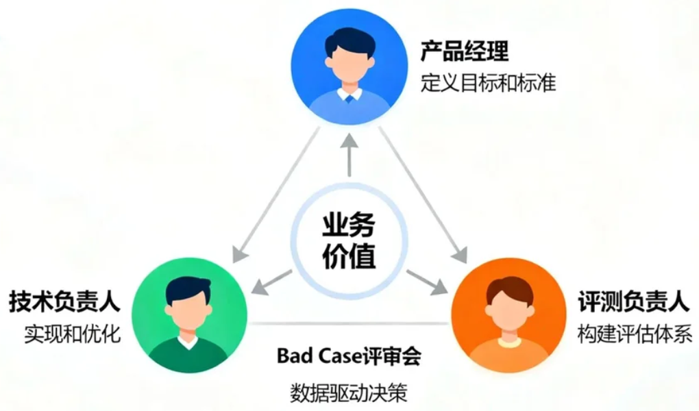 在评测驱动的模式下,传统的角色分工需要重塑,形成一个目标一致、权责清晰的“铁三角”协作模型。