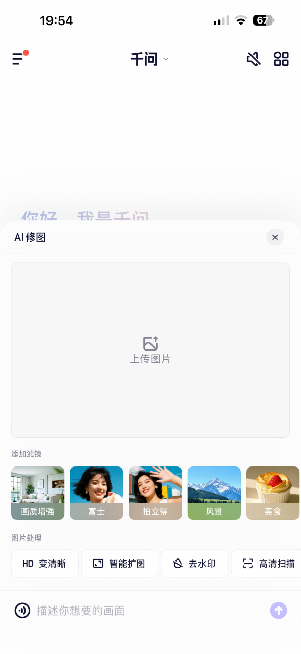图片编辑功能默认有不同的滤镜,同时设置了扩图、去水印等常见操作。