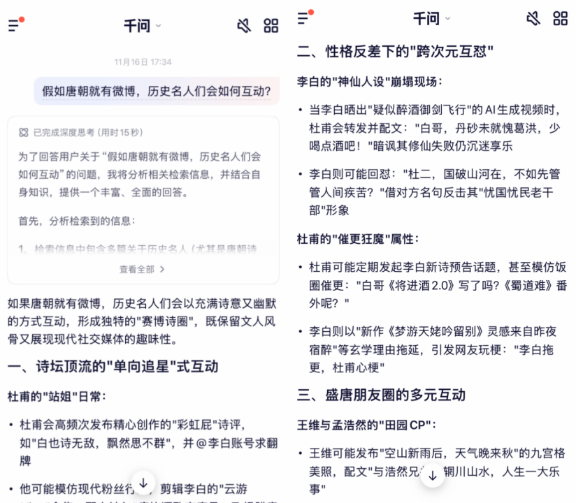 可以看到,千问的答案一开始就精准拿捏李杜的性格反差,然后过渡到王维、孟浩然等不同圈层的互动,再加上了安史之乱的补充,到最后的假想微博体的文化意义。