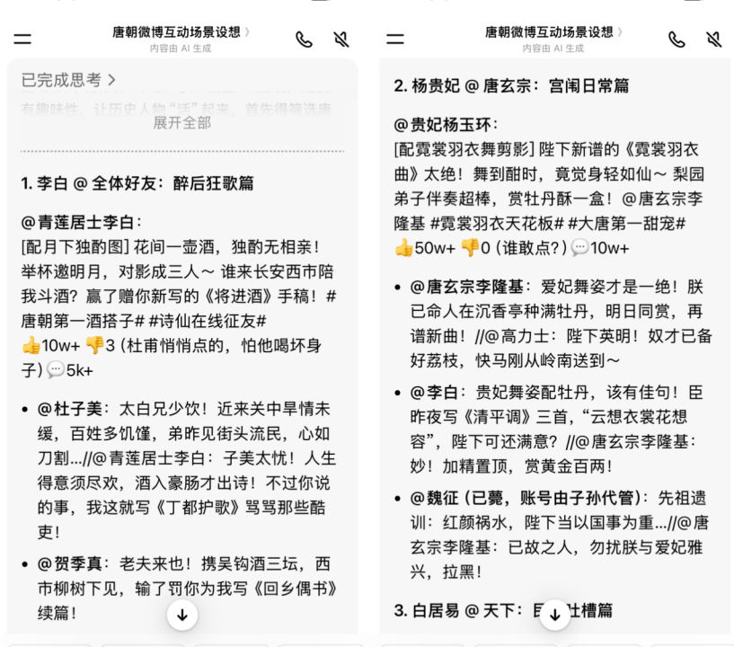 直接将博文和评论互动列了出来,同时还加入了杨玉环这样的角色,符合豆包“内容向”、“娱乐向”的过往风格。