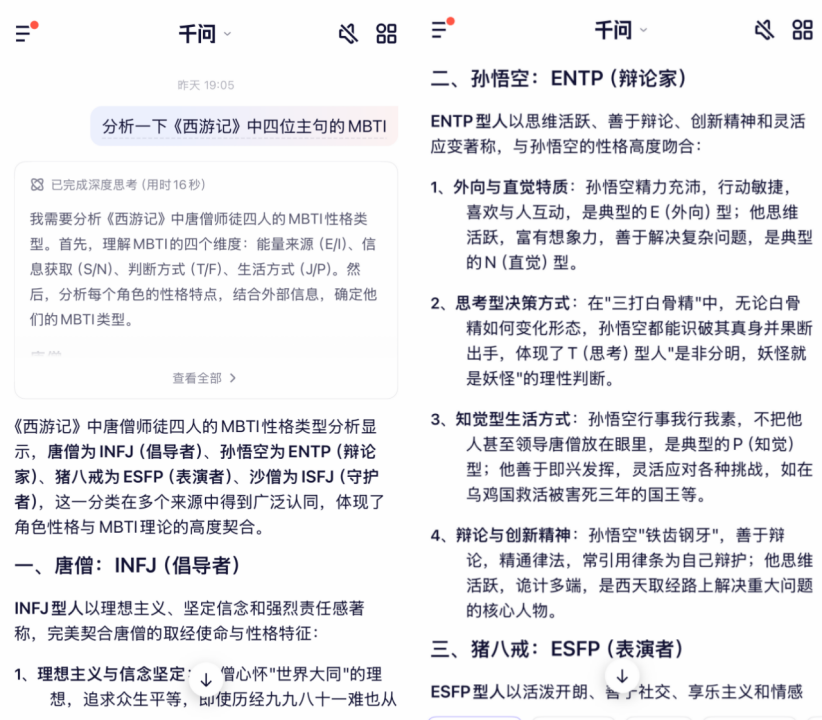 先看结果,千问的结果是——唐僧INFJ、孙悟空ENTP、猪八戒ESFP、沙僧ISFJ。