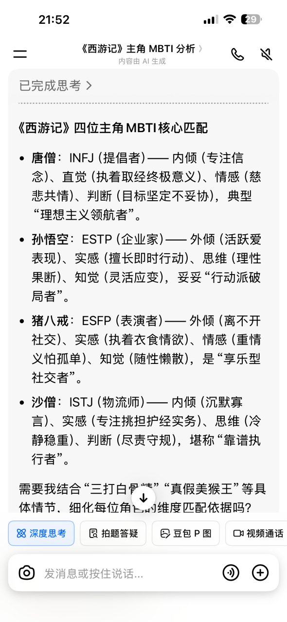 而豆包的结果是——唐僧INFJ、孙悟空ESTP、猪八戒ESFP、沙僧ISTJ。