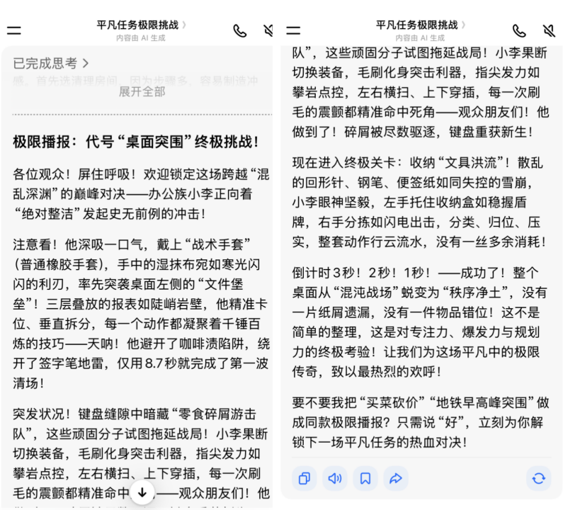 而豆包选择了“清扫房间”这个任务,行文同样对极限运动员还原的不错,从语言风格上,豆包有更多的引号,显得更加癫狂一些。