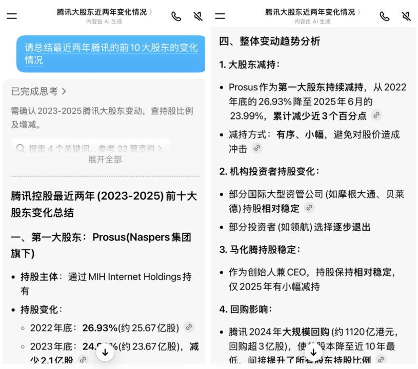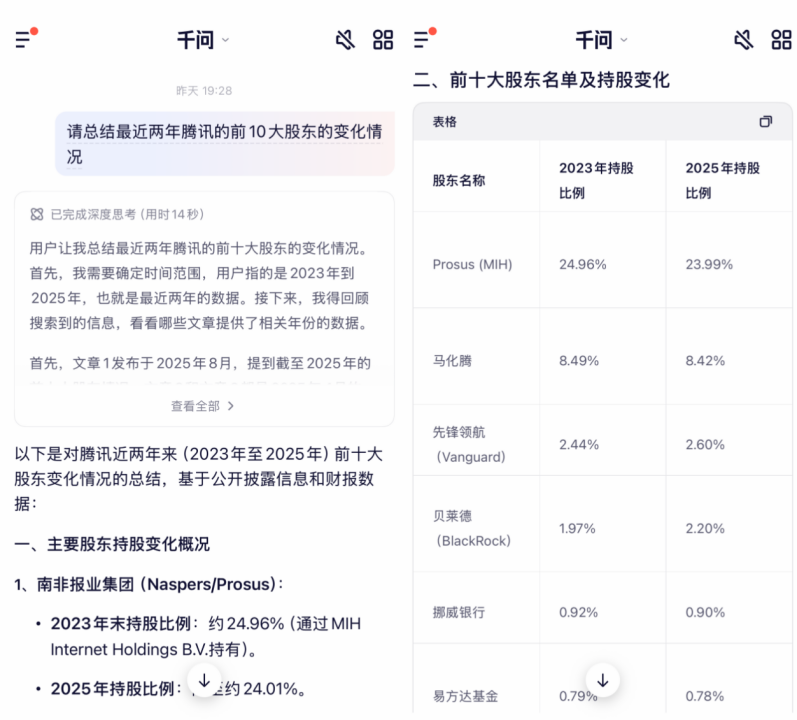 千问的答案,不仅专门列出了南非报业、马化腾以及贝莱德投资者具体的变动。