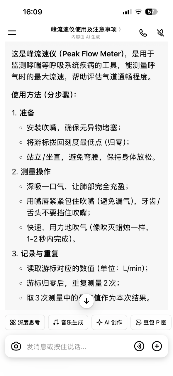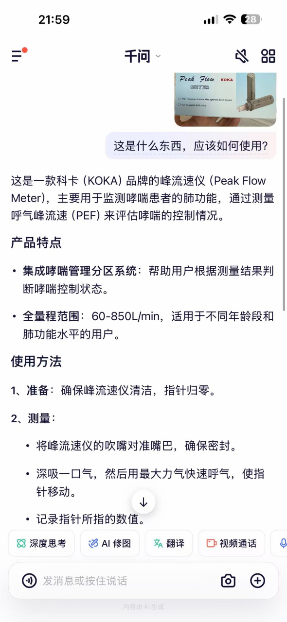 千问准确识别出了这是用于监测哮喘和慢阻肺最大流速的峰速仪,给出了品牌、产品特点、实用方法和注意事项,最后还给出了淘宝链接。