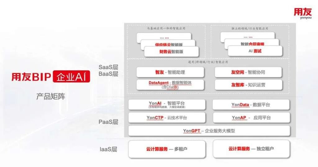 用友BIP企业AI产品矩阵,展示了从IaaS到SaaS层的完整布局