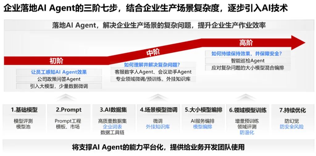 在验证初步价值后,企业应重点构建平台化能力。可借鉴”段位”划分策略,帮助员工逐步掌握AIAgent的使用,同时通过原厂轻咨询、内置最佳实践和应用效果评测,确保AI Agent达到生产级标准。此阶段的关键是建立标准化流程和工具链,使Agent开发从”手工作业”转向”工业化生产”。
