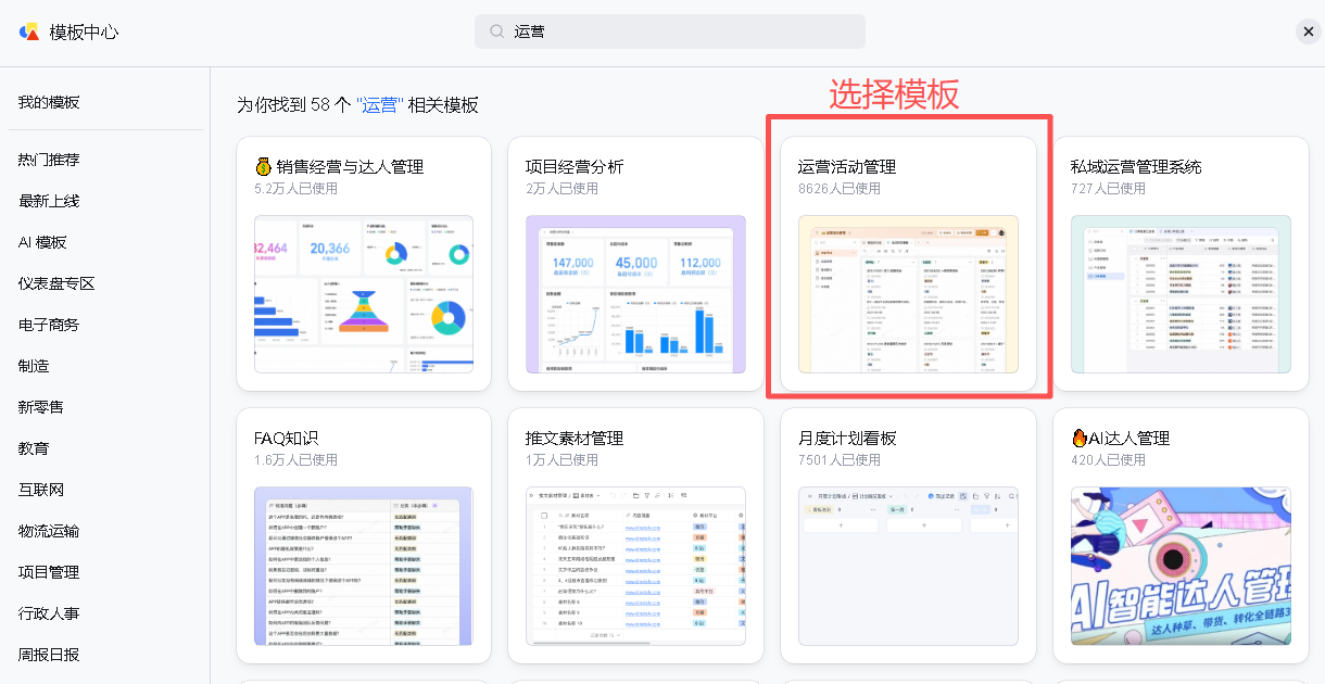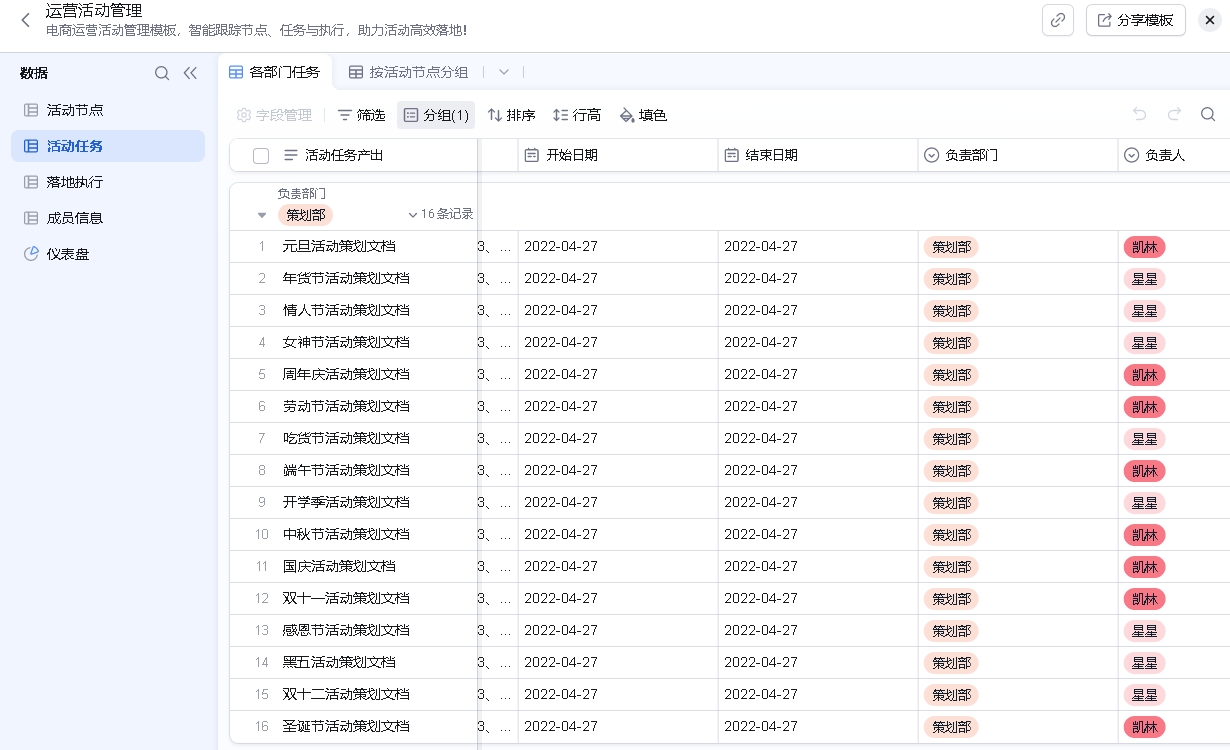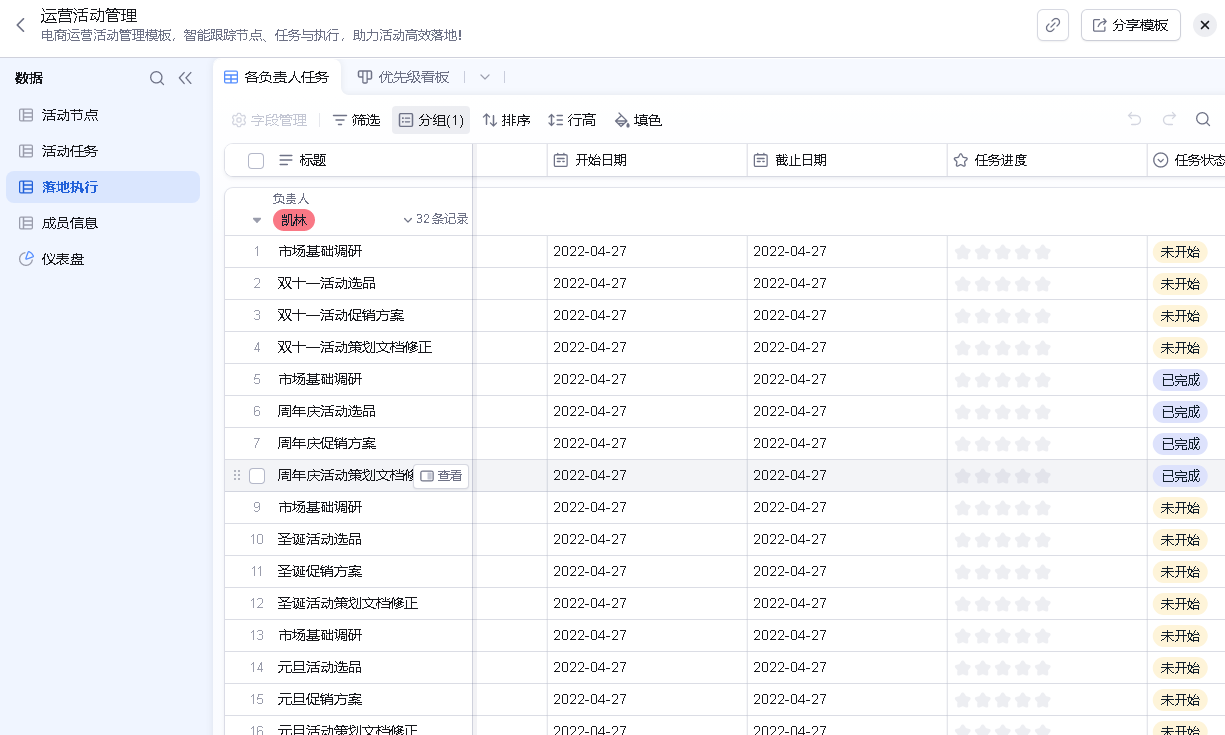 一键启用专属模板:在AI表格中选择 “运营活动管理” 模板,系统自动生成 “活动节点”“活动任务”“落地执行” 三个关联表格,包含任务类型、负责人、截止时间、任务状态等预设字段,无需从零搭建;