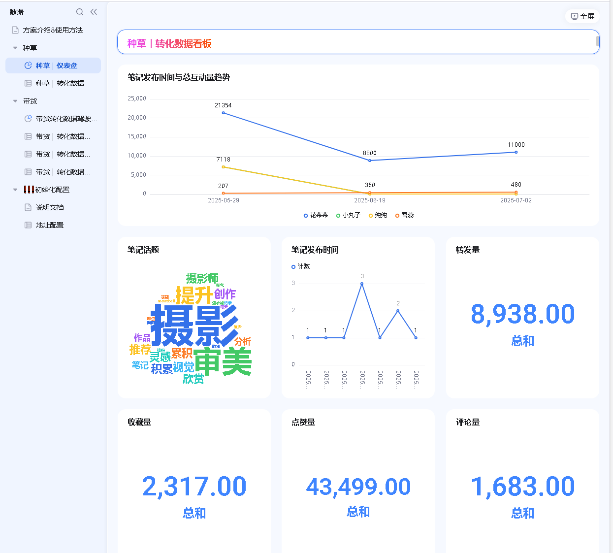 3)自动化报表与复盘:基于抓取的数据,通过“AI 仪表盘”一键生成柱状图、折线图等可视化图表,支持多维度切换查看。小编设置了 “每日10点自动推送” 功能,系统会将核心数据与趋势图表直接发送到群,月度复盘时只需导出仪表盘数据,10分钟就能完成过去半天的工作量。