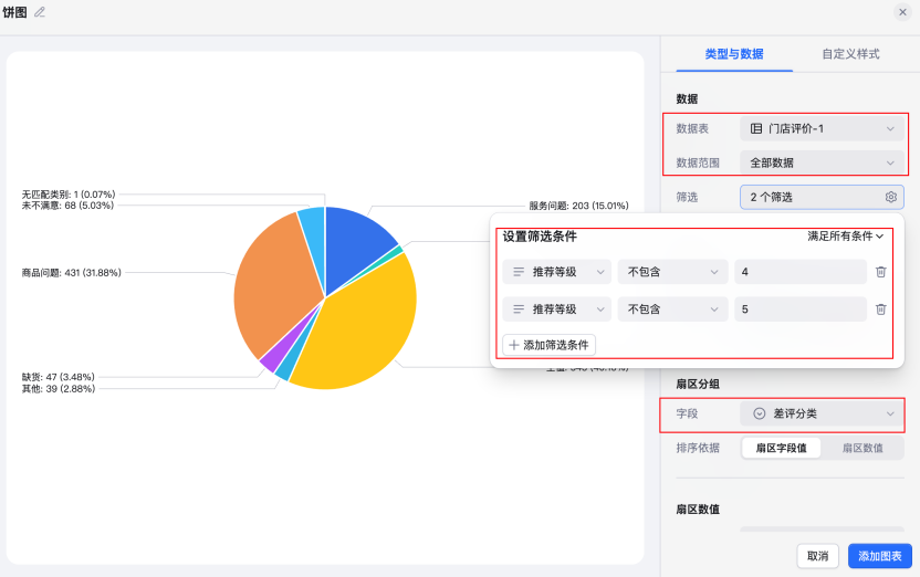 配置逻辑:添加 “筛选条件”(排除 4 星、5 星好评,仅保留差评)+“时间筛选”(限定 “本月”),选择 “差评分类” 为扇区分组字段;