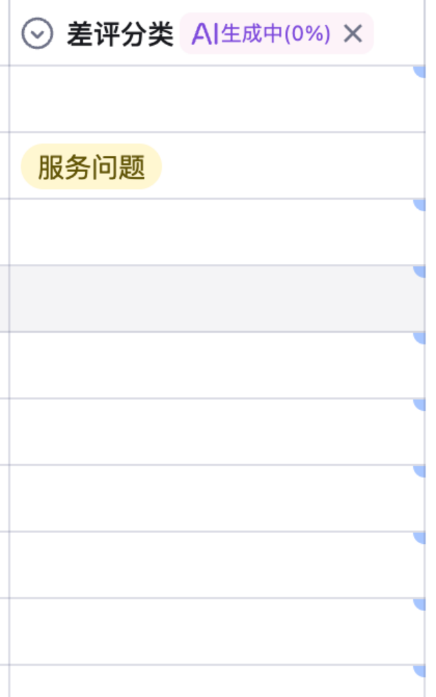 - 输入自定义分类规则(提示词):“按文本内容列的评价,将原因分为【商品问题】【服务问题】【缺货】【环境问题】,无不满意标注【未不满意】,无法判断选【其他】”,点击 “保存并生成”。