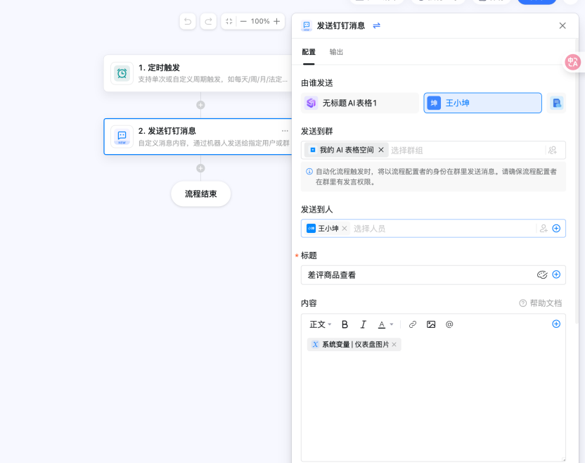 配置步骤:进入 “自动化” 模块,选择 “定时触发”(每周一 9:00),执行动作设为 “发送钉钉消息”,接收对象选择 “采购部群”,消息内容嵌入 “本周商品差评看板图片”+“差评 TOP3 商品清单”;