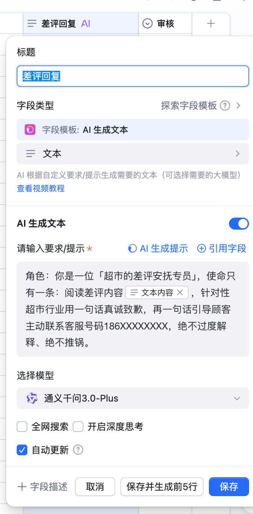 1)新建 “差评回复” 字段,选择 “AI 生成文本” 模板;