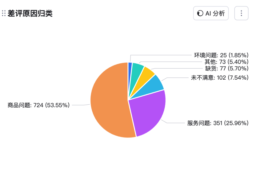 呈现结果:本月差评中,【商品问题】占比55%(724 条)、【服务问题】占比 25.96%(351 条)、【缺货】占比 5.70%(77 条),运营可直接定位 “商品质量” 为核心改进方向;