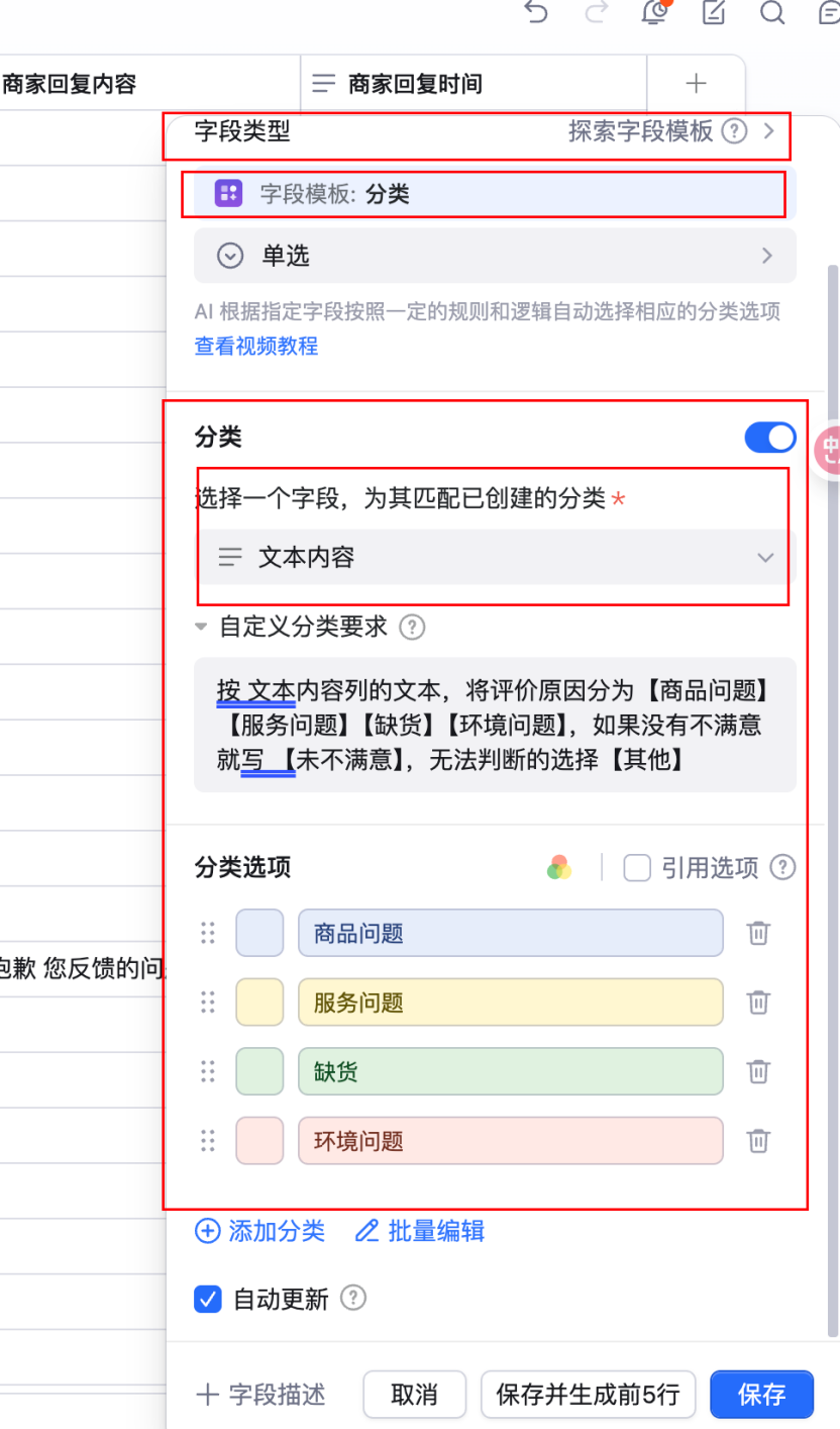 - 在钉钉 AI 表格中新建 “差评分类” 字段,选择 “分类” 模板,字段来源设为 “文本内容”(即评价原文);