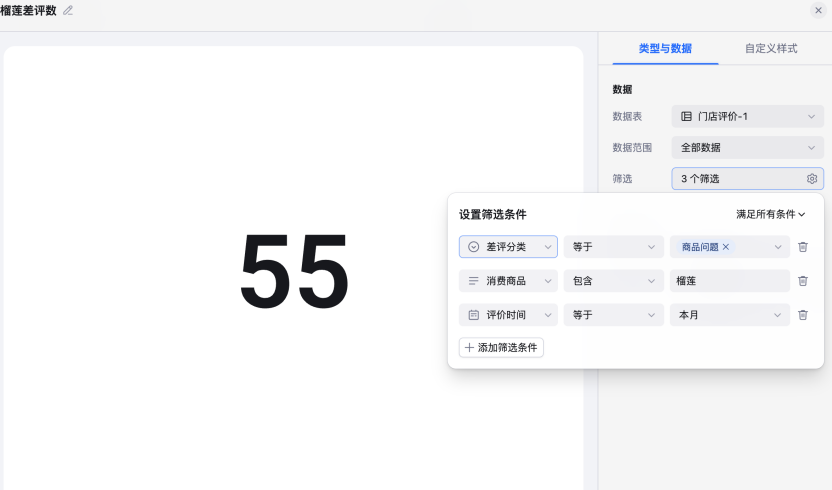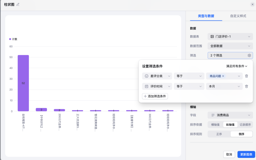 配置逻辑:添加 “筛选条件”(差评分类 = 商品问题 + 评价时间 = 本月),选择 “消费商品” 为横轴字段、“记录数” 为纵轴字段;