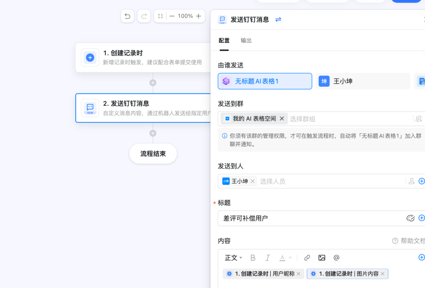 配置步骤:选择 “触发条件”(新增记录为 “差评” 且 “用户昵称未匿名”),执行动作设为 “发送钉钉消息”,接收对象选择 “区域督导群”,消息内容包含 “用户昵称 + 评价文本 + 用户头像链接”(便于督导识别用户、跟进补偿);