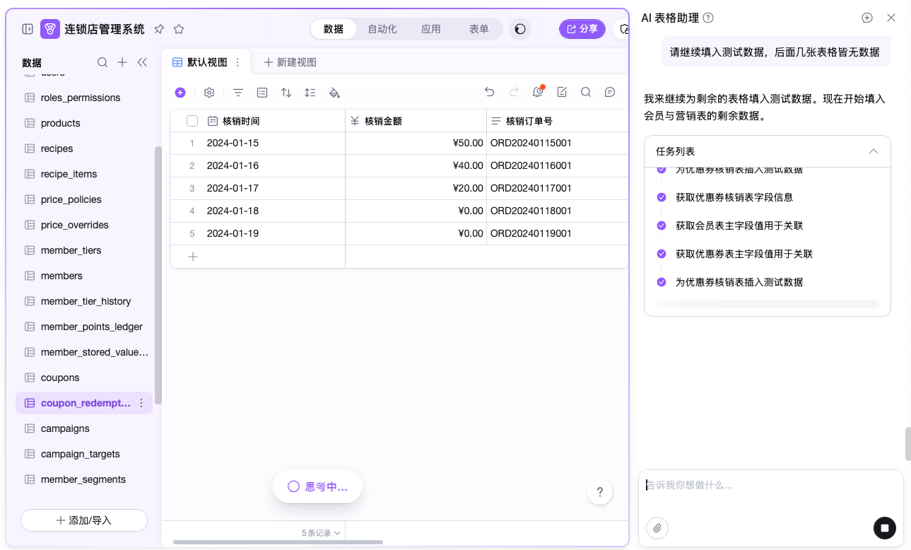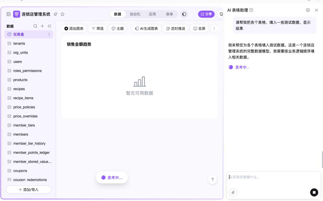 填入测试数据后,再让AI按每一个数据表的核心目标,生成数据看板,就能简单验证数据表的设计是否正确(相当于程序里的单元测试…)