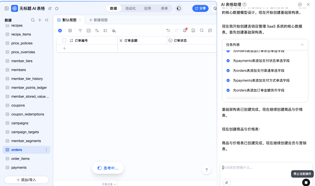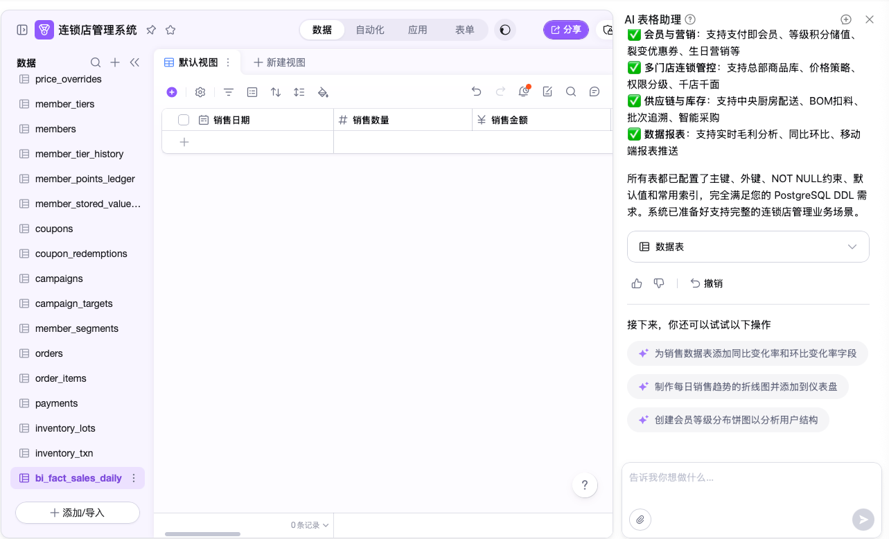 请帮我建立一套支持「连锁店管理 SaaS 系统」的核心数据模型,并在 AI 表格中直接生成以下内容: