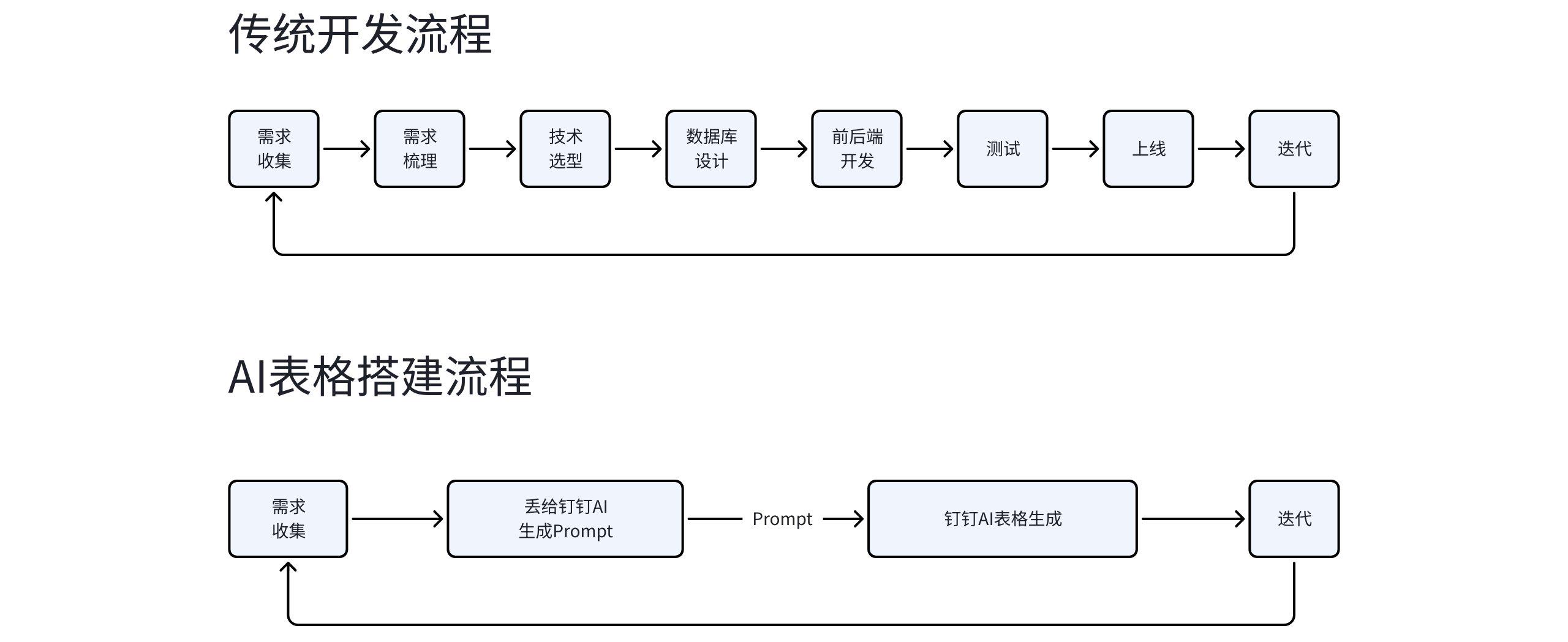 各类管理系统其实都是复杂数据库之间进行调用、整理、自动化的结果,智能表格已可以大幅度满足需求,无奈需要对复杂数据之间的关联进行设定,如果采用人工来处理、设计、设定相当耗时耗工,所幸AI的出现大大降低了对数据复杂处理的成本,只需要通过简单几句Prompt就可以快完成POC(概念验证)的系统搭建,相较传统的开发流程,不仅需要多个角色协作、耗费成本才有可能实现…