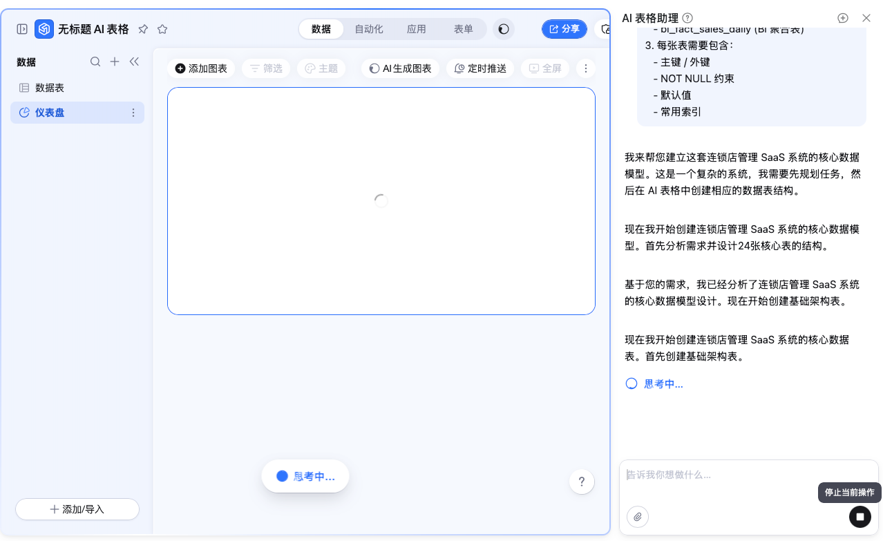 然后这个生成的过程相当疗愈,看着一个table都没有的AI表格,突然渐渐地按这Prompt的要求,把一个个table创建出来,AI还会告诉他正在做哪一步的任务,真的如第一次在现场看魔术一样,Amazing