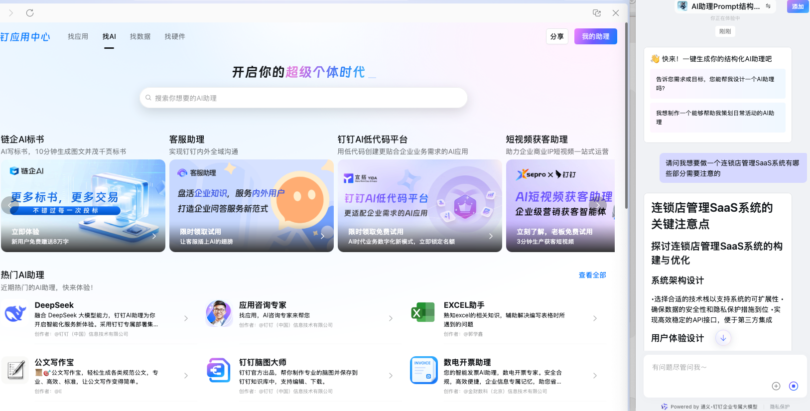 我就直接在钉钉上的AI助理,在AI市场上找到专门生成Prompt的AI问,想做一个连锁店管理系统,需要考虑哪些东西、功能、数据表