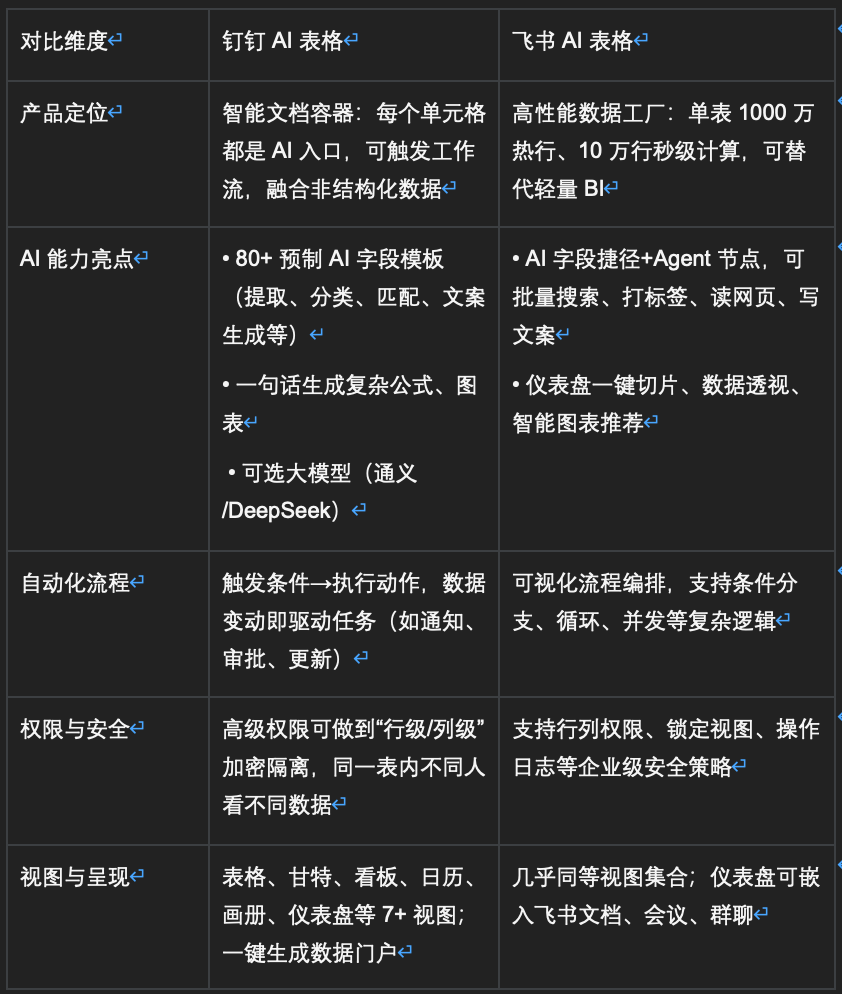 国内的三大(钉钉、飞书、企业微信)办公平台各有千秋与特色,皆整合多个办公工具到各自的办公生态中,但其中企业微信的智能表格发展较晚、且功能较不齐全,故此先优先比较了飞书、钉钉的AI表格,大致比较如下