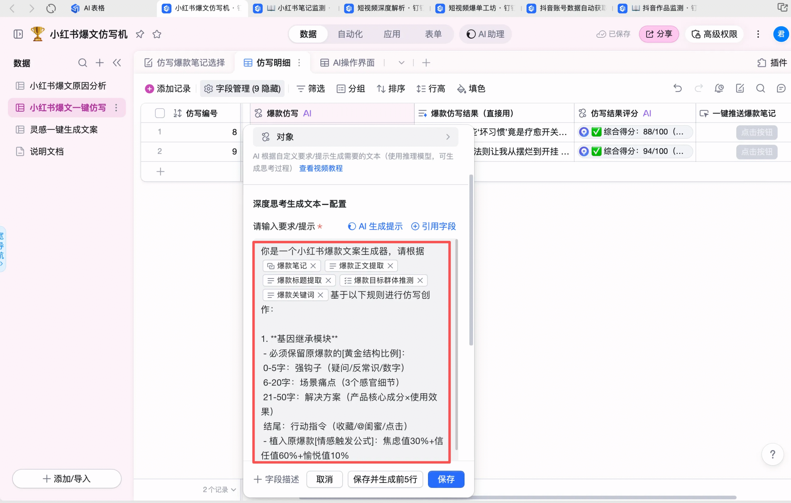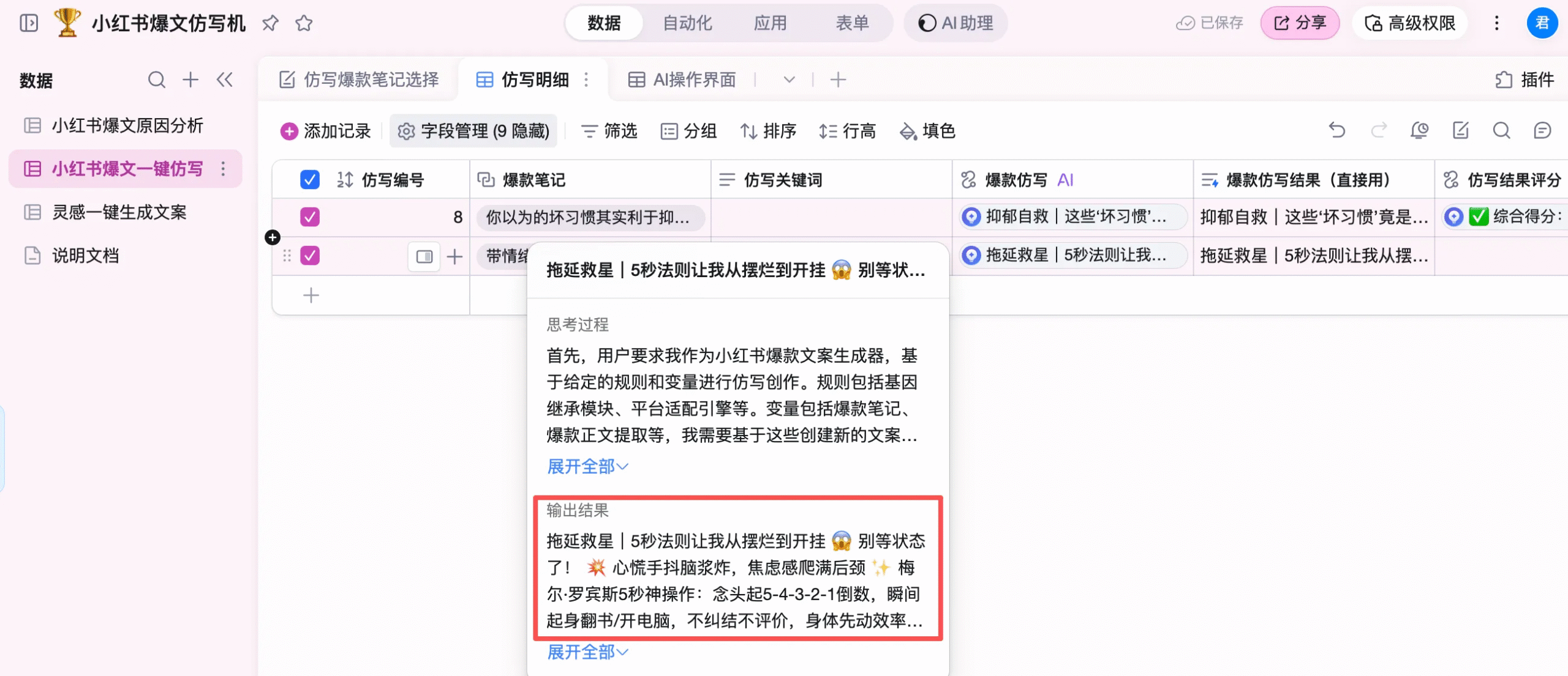 更重要的是,我可以一次性对几十篇爆款笔记进行批量解析和不同角度不同关键词的仿写,产出数十个不同角度的文案初稿。表格里面还有一个AI“仿写评分”字段,设置了基于结构还原度、情绪浓度等维度给出评分参考,我会对评分最高的几个结果进行审核编辑发送。这直接将我从繁重的重复劳动中解放出来,有更多精力专注于选题策略和创意发散。