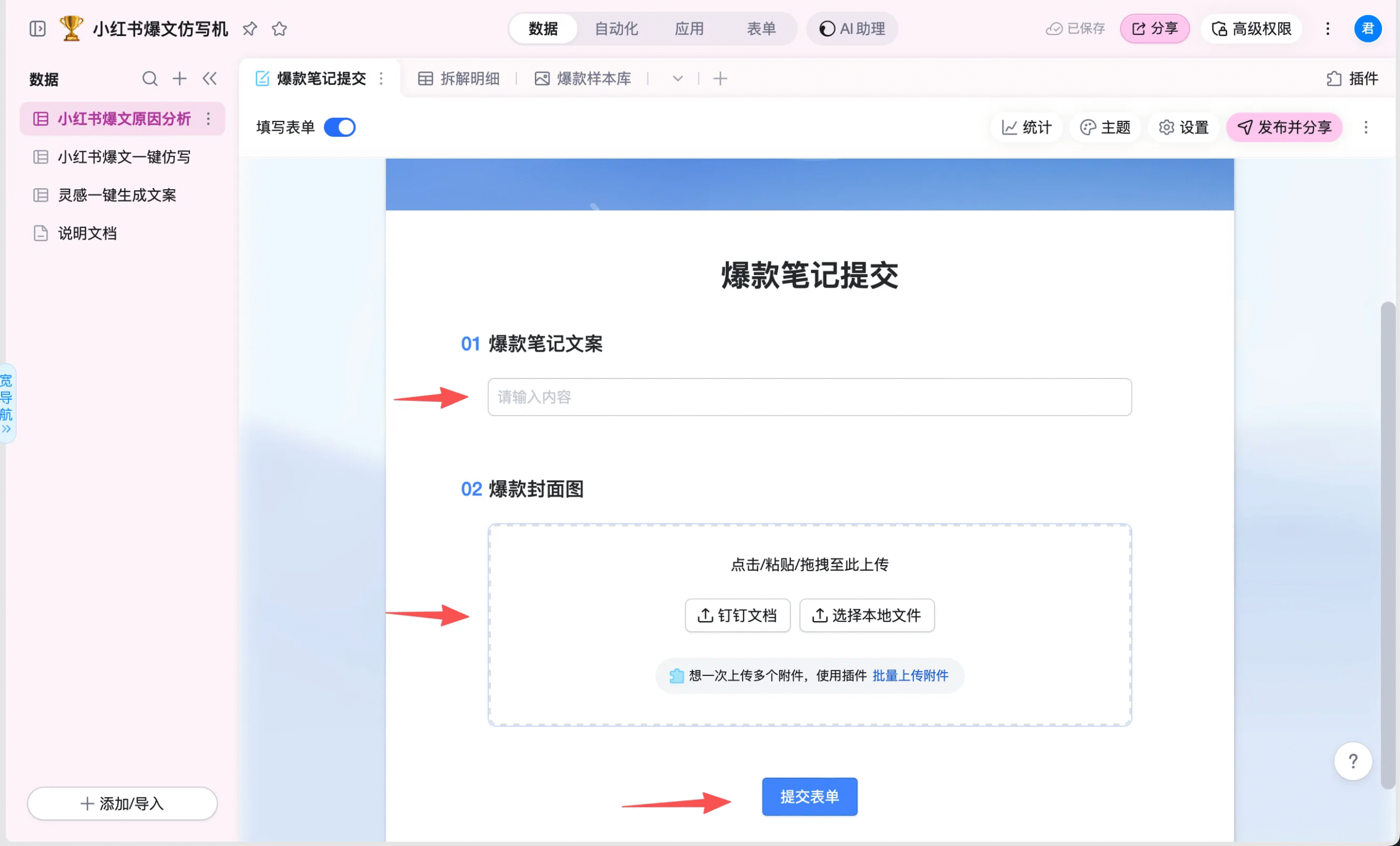传统的爆款分析,极度依赖个人经验,低效且难以复制。但这个模板已经为我们搭建好了一个“爆款笔记分析库”, 实现了爆款公式的可视化解构!只需要复制粘贴下爆款笔记的正文和首图,在表单中点击提交,表格就开始自动工作了: