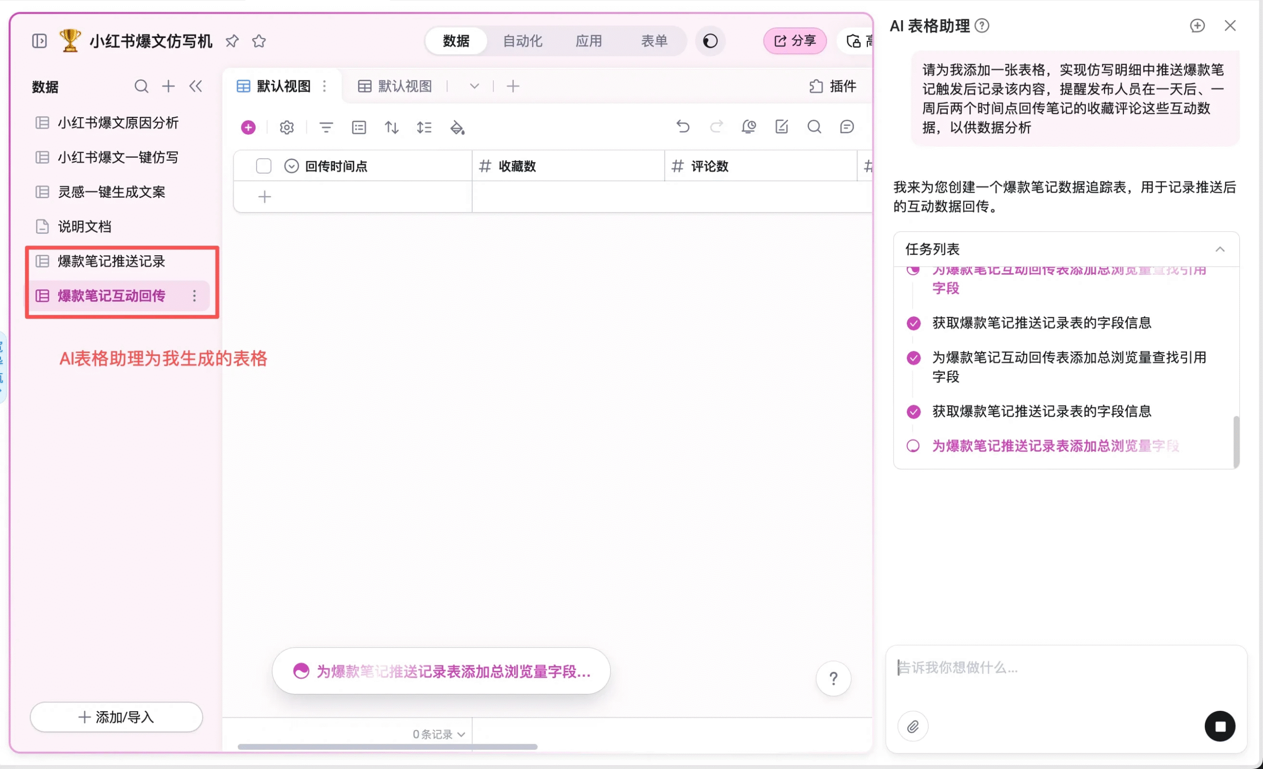 模板用不习惯也没关系,钉钉AI表格还支持自然语言按自己的需求来生成。比如这个小红书爆款笔记仿写模板,工作流只到了生成素材就结束了,缺少了后面的笔记发布后数据分析阶段信息。打开钉钉表格的AI助理,我用大白话说了我的需求,一分钟就帮我生成了我需要的表格结构,字段、公式与仪表板都有了,这不得给钉钉AI表格加个鸡腿?