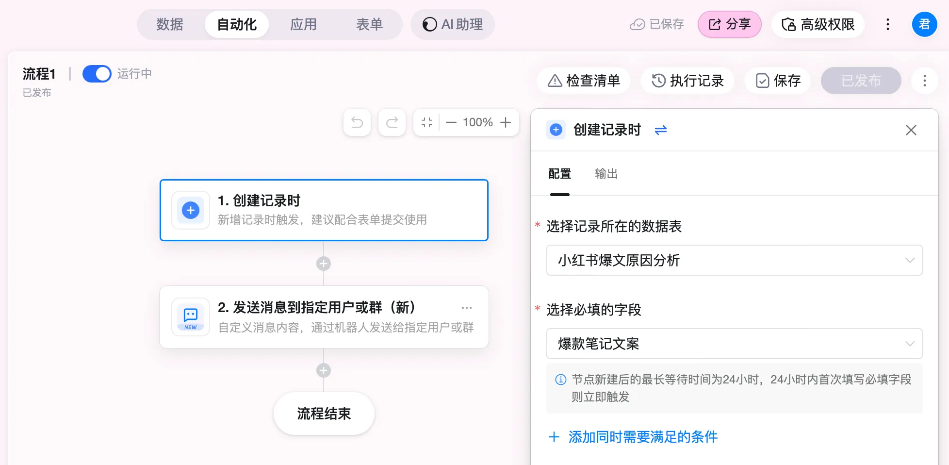 - 执行:自动将【爆款文案】字段内生成的内容,推送至钉钉团队群,让负责内容的小伙伴审核。