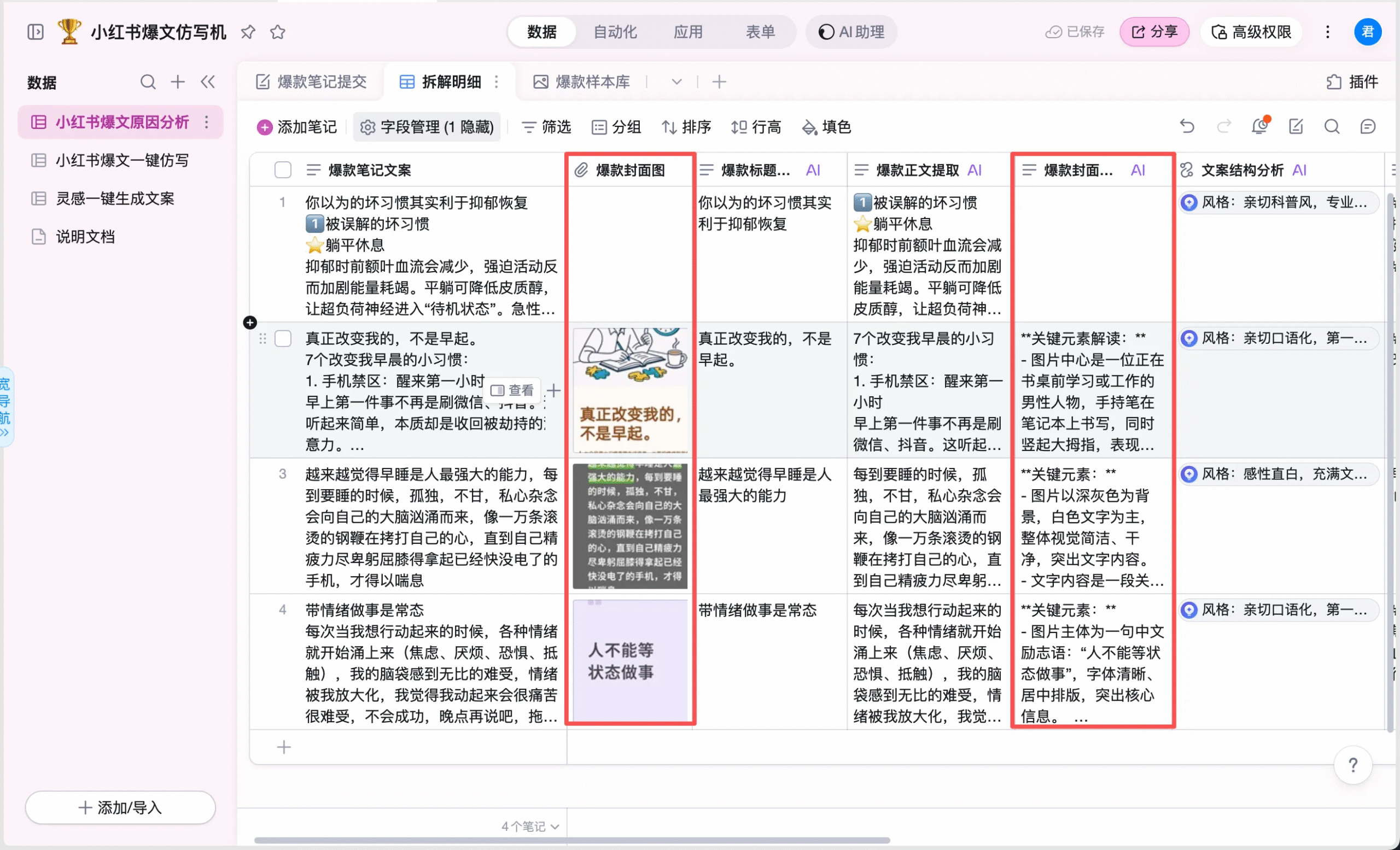 表格拆解了笔记内容、解读封面图、提取文案结构、关键词、钩子类型、目标人群等等爆款元素。模板里面已经按爆款笔记的底层逻辑列好了这些必备字段,每一个单元格都像是为你打工的爆款笔记拆解专家,使用阿里AI的能力来全方位解读爆款。当AI表格工作拆解完了这一条笔记后,我们也得到了自己的爆款笔记知识库,后面再让AI来生成文案的时候,直接使用这些历史笔记与爆款公式,分分钟产出属于自己的爆款笔记!