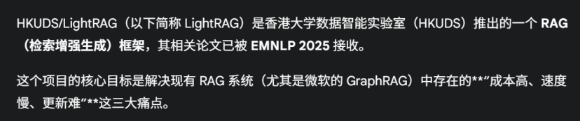 我选的项目是GitHub上最近星数非常高的项目,叫做LightRAG。这是通过整合图结构来增强上下文感知和高效信息检索,从而改进检索增强生成,实现了更高的准确性和更快的响应时间。
