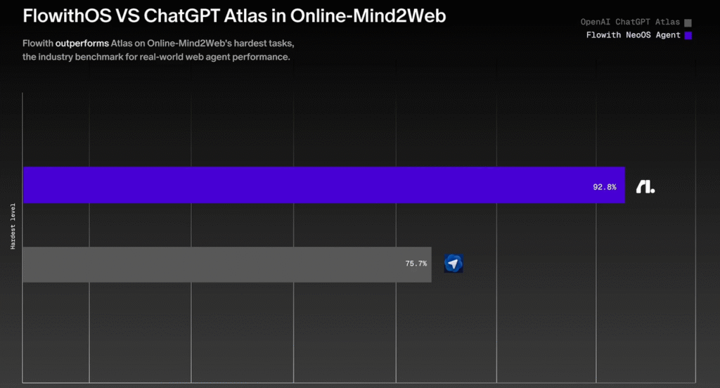 Flowith OS,这款被定义为全球首个为 AI Agent 原生构建的操作系统的产品,在权威测试平台 Online-Mind2Web 上取得了95.4%的综合平均准确率,在最高难度级别上更是以92.8%的准确率超越了OpenAI的 ChatGPT Atlas(75.7%)