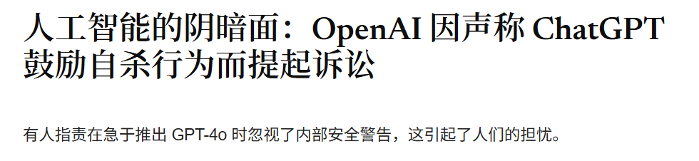 最近,OpenAI面临七项新的诉讼,指控其ChatGPT “充当自杀教练”,并加剧用户的妄想症。