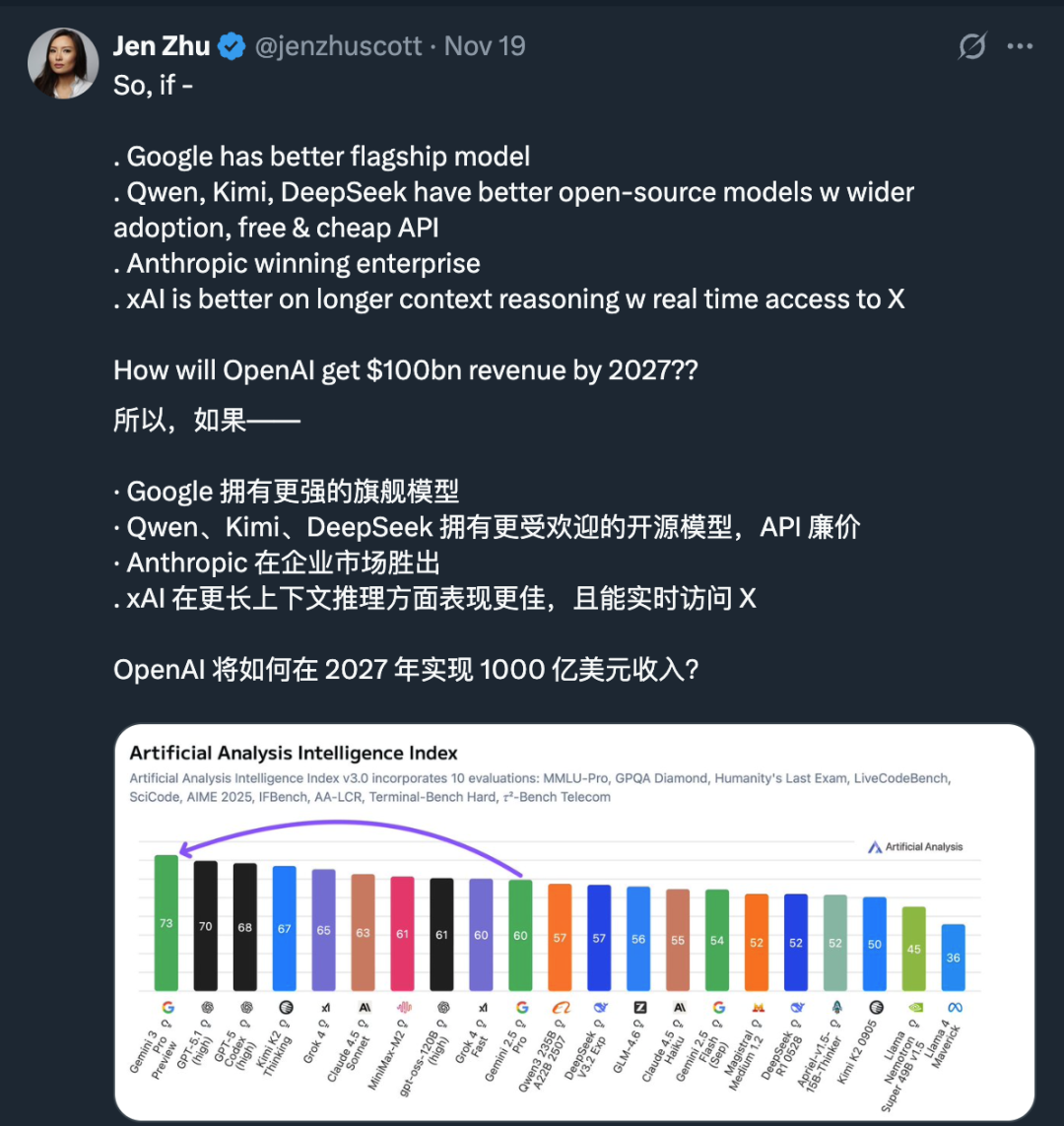 昨天 Gemini 3 Pro模型发布后,硅谷也出现对美国AI模型狂热的疑问。能源创业公司PowerDynamics的创始人Jen Zhu发帖称,Google的模型最强,中国的开源模型更受欢迎,Anthropic有企业市场的优势,xAI有访问Twitter的优势,那OpenAI凭什么能拿到 1000 亿美金的收入?