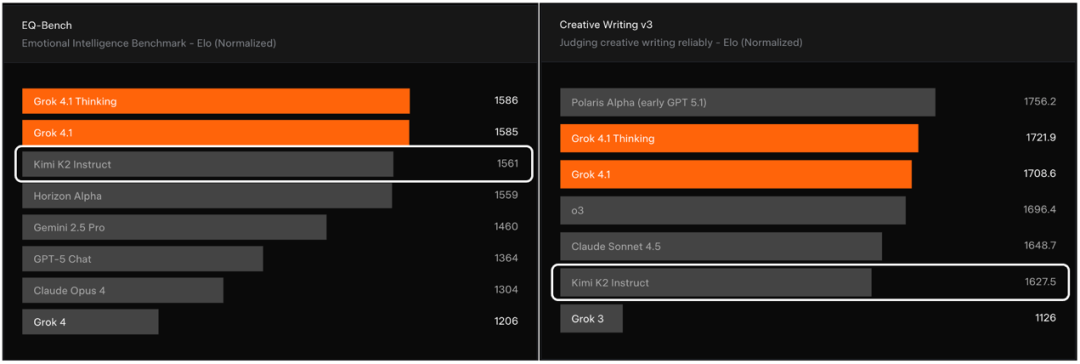 几乎同一时间,马斯克发布 Grok 4.1 时做了一个对比评分,列出了多个顶尖 AI 模型的表现。在这个对比中,Kimi K2 是唯一被当作“参考文献”的中国模型,而且用的还不是最新的 Thinking 版本,只是基础版的 K2。即便如此,它的分数依然领先于许多知名模型。我觉得这个细节特别值得玩味。马斯克作为 AI 领域最具影响力的人物之一,他选择将 Kimi K2 纳入对比范围,本身就是一种认可。