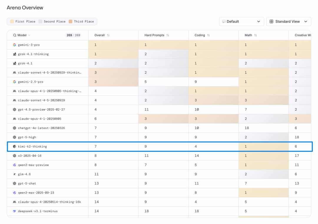 在全球最权威的大模型竞技场 LM Arena 上,Kimi K2 Thinking 再次夺得全球开源模型第一名,在开闭源综合排名中位列第七。这个榜单不是由某个公司或机构单方面评定的,而是基于全球用户的真实使用反馈和盲测结果。用户在不知道使用哪个模型的情况下,对不同模型的回答进行评分,最终汇总出排名。这种方式最能反映模型在实际应用中的真实表现。Kimi K2 Thinking 能在这样的榜单上名列前茅,证明在用户体验层面也获得了广泛认可。