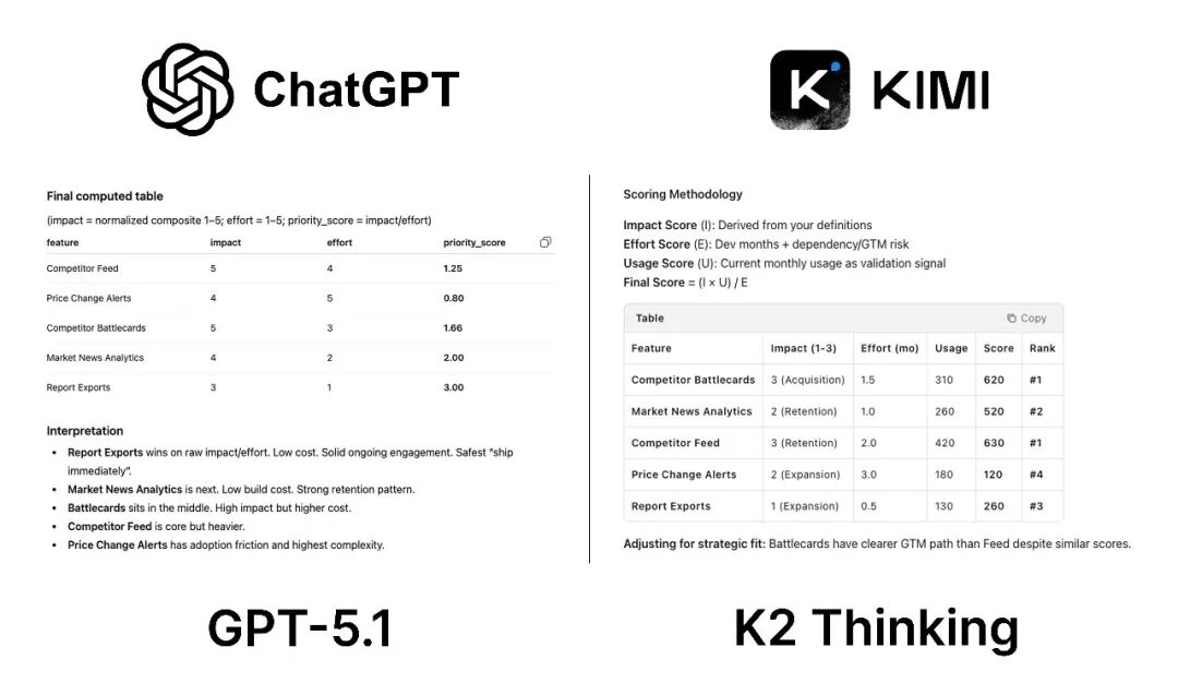 他做了一个非常实际的测试。他给 GPT-5.1 和 Kimi K2 Thinking 提了同一个产品决策问题:基于用户参与数据,研究竞争对手的解决方案,比较他们的方法、采用率和定价策略,然后按影响力和工作量对功能选项进行评分,最后推荐发布优先级。这是一个典型的产品经理日常工作场景,既需要数据分析能力,也需要产品判断力。