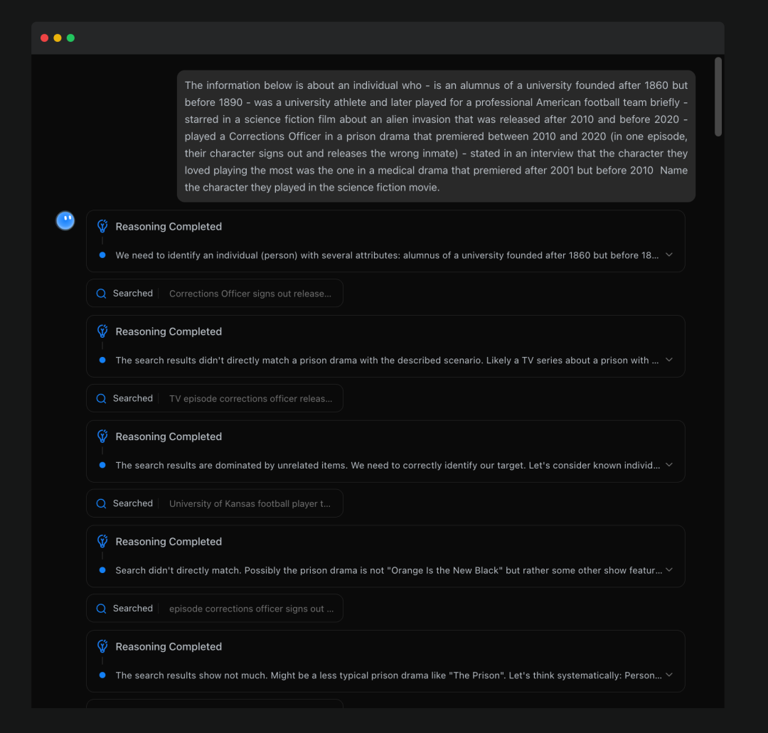 要理解 Kimi K2 Thinking为什么表现不错,我需要解释一下它采用的”交织推理”(Interleaved Reasoning)技术。传统的推理模型只有一步“思考→行动”的过程,它可以从互联网上获取信息,然后就不再与外界互动,而是不断地想。这种方式在简单任务上可能还行,但一旦任务变得复杂,需要多步骤协调时,就很容易出错。