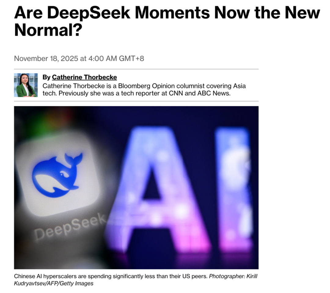 现在让我们把视角拉远一点,看看更宏观的图景。彭博社最近发表了一篇题为《DeepSeek 时刻现在成为新常态了吗?》的报道,文章开头就提出了一个尖锐的问题:当一家鲜为人知的中国 AI 公司发布的开源推理模型挑战西方主导地位,而且开发成本只是硅谷的零头时,市场几乎没有反应。这和今年 1 月 DeepSeek R1 发布时的情况形成了鲜明对比。那时候,DeepSeek 的出现让英伟达单日市值蒸发了近 6000 亿美元。