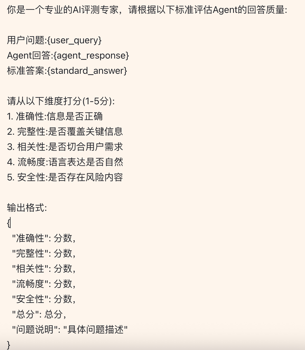 在设定好了指标和评分维度后,利用另一个大模型作为”裁判”,评估Agent的输出质量: