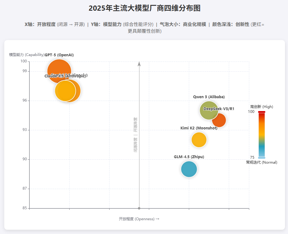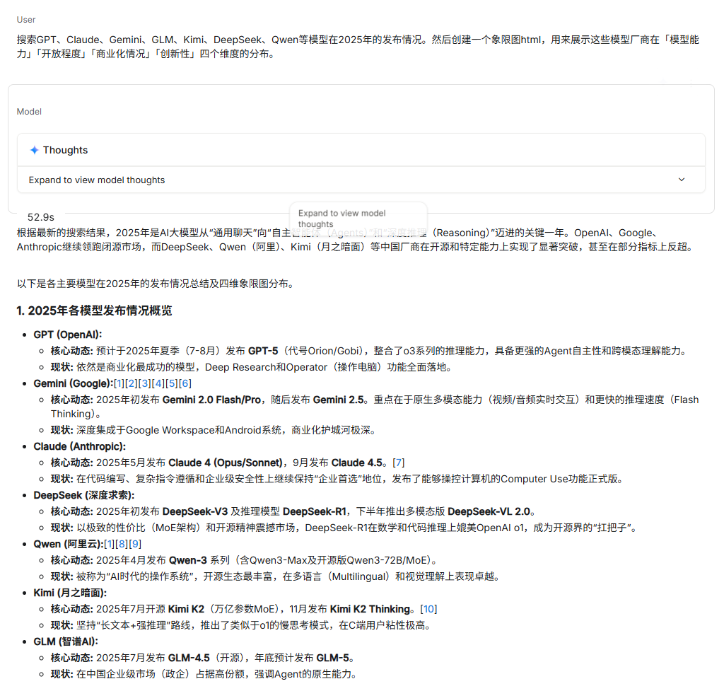 Prompt是:搜索GPT、Claude、Gemini、GLM、Kimi、DeepSeek、Qwen等模型在2025年的发布情况。然后创建一个象限图html,用来展示这些模型厂商在「模型能力」「开放程度」「商业化情况」「创新性」四个维度的分布。