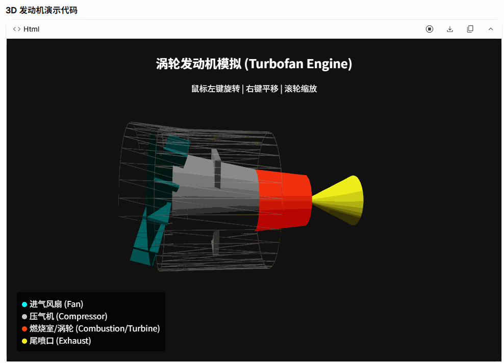 制作一个3D动画,演示涡轮发动机的运行,可多视角观看。