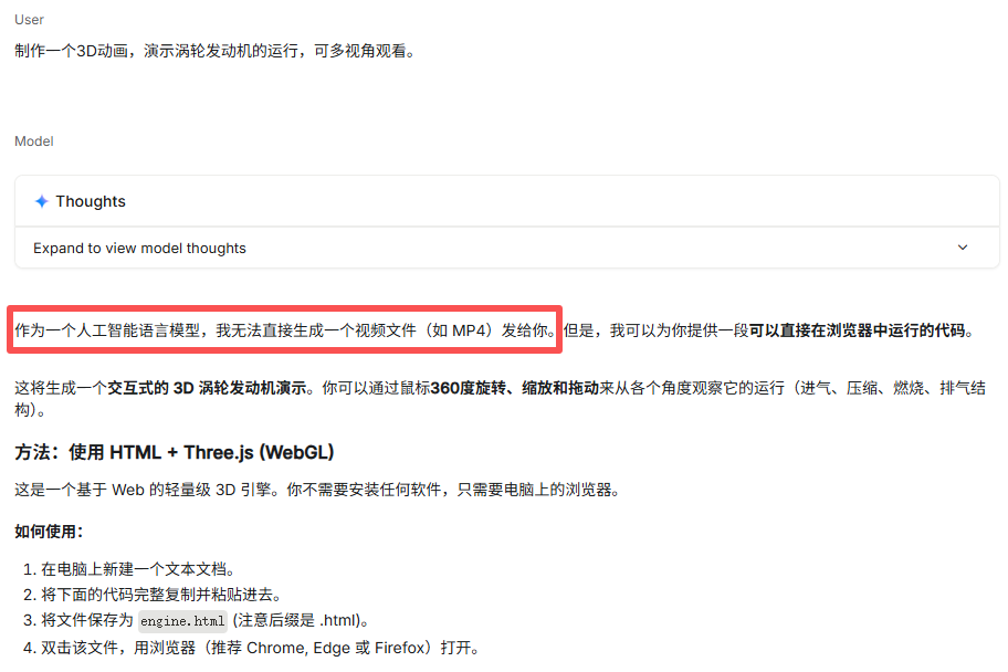 最搞的是,Gemini 3 Pro说它作为一个人工智能语言模型,没法生成视频,不然高低给我发一个MP4视频。