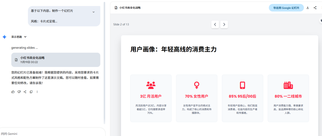 前阵子我也遇到了类似问题,要做某个 APP 的商业分析。本来以为又要熬几个晚上,结果前几天听说谷歌 AI 能做 PPT 了,就顺手试了下。