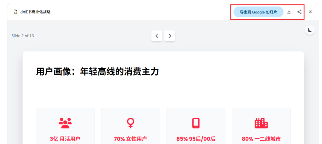 - 导出到 Google 幻灯片:想接着细改,就点这个。改字体、调大小都支持,跟用普通 PPT 没区别