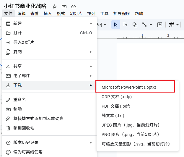 如果想存为 .pptx 文件,就先导出到 Google 幻灯片。