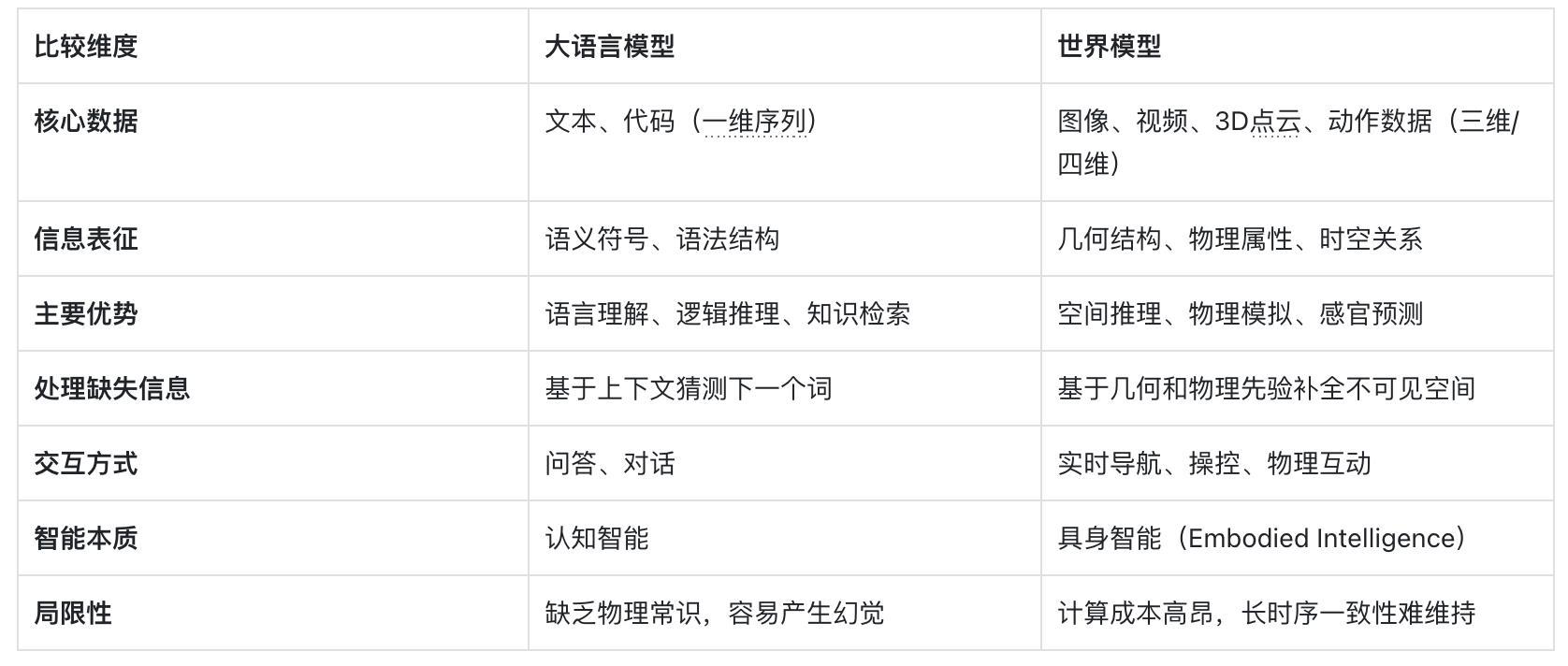 为了更清晰地界定世界模型的价值,我们需要将其与当前的主流范式——大语言模型进行系统性的对比。下表总结了两者在多个维度的差异: