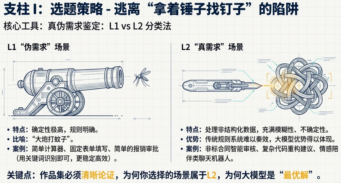 所以,在你的作品集里,第一步就是要向面试官清晰地展示,你选择的这个场景,它属于L2,而不是L1。你要说清楚,这个场景的“非结构化”和“不确定性”体现在哪里,为什么传统的方案搞不定,为什么大模型是解决这个问题的“最优解”,而不是“唯一解”。这种思考深度,一下子就能把你和那些“为了AI而AI”的候选人区分开。